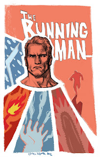 The Running Man. Had some fun with this one. I wanted to draw Richard Dawson in there somewhere cause he's a pimp, but I didn't want to crowd the layout any more, it's already got 6 people in there. If I get a little more time I'm going to render the colors more, right now it's mostly flats. No time today since it's the 4th AND Amy's birthday.